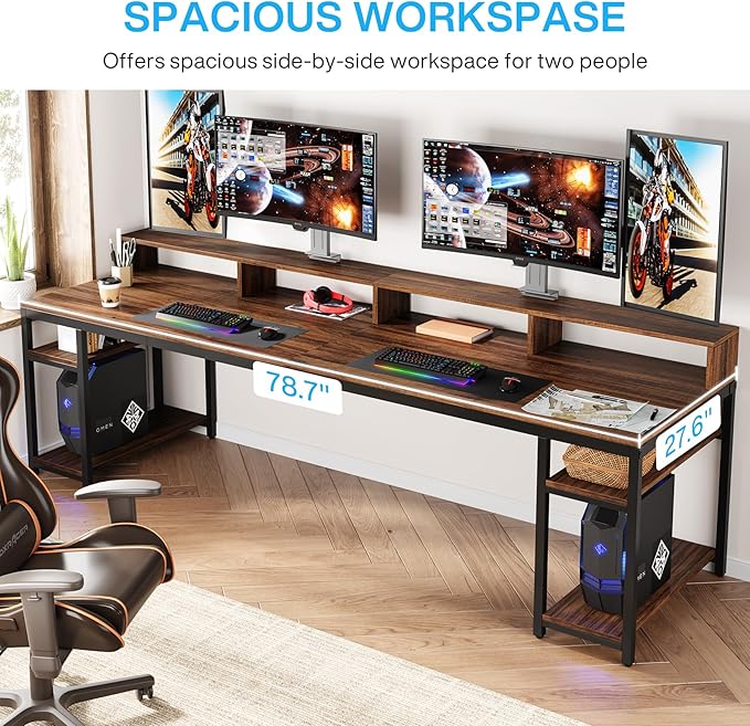 OfficeIn 78" Industrial Double Desk – A spacious workstation for two, featuring an ergonomic monitor stand, ample storage shelves, and a rustic brown finish with a black metal frame. Built for durability and style, it supports up to 350 lbs and offers easy assembly.