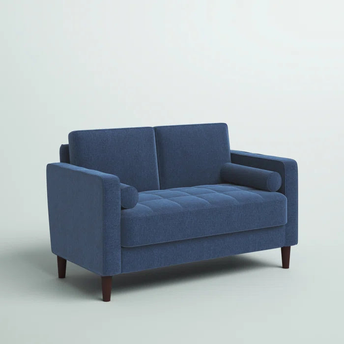 A marriage of comfort and contemporary allure, the eye-catching mid-century modern loveseat is sure to lend style to your living room. It's founded atop four tapered wooden feet, and its clean-lined frame is crafted from kiln-dried hardwood and is covered in neutral-hued fabric upholstery. This loveseat's high-density foam cushioning provides ultimate comfort to last. While this loveseat's solid hue fabric makes it a stylish stage for plush patterned pillows and faux fur blankets, it's equally elegant all on its own thanks to its square arms, a button-tufted seat cushion, and included bolster pillows.