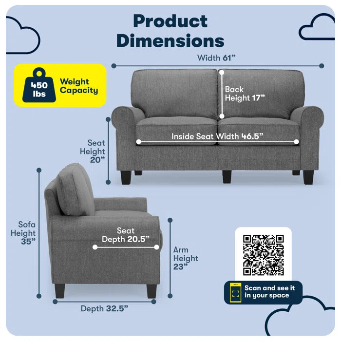 OfficeIn Loveseat – A compact and stylish loveseat with a pillow back design, ideal for smaller spaces. Featuring durable, easy-to-clean upholstery, high-density foam cushions, and a classic rolled-arm silhouette, it offers lasting comfort and effortless setup.