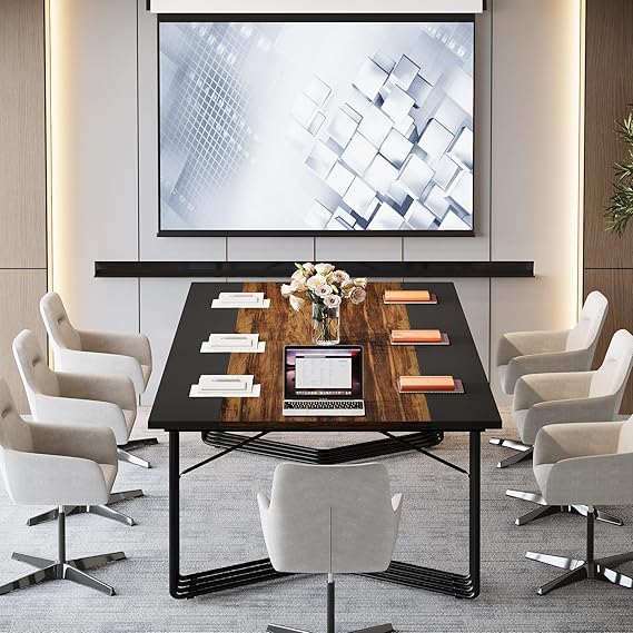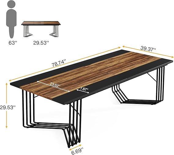 This stylish conference table (39.37" D x 78.74" W x 29.53" H) features a rustic brown & black tabletop with a unique metal frame, adding a sophisticated touch to any space. Designed for spacious & functional use, it's perfect for large meetings, brainstorming sessions, or small team discussions. Its versatile design allows it to serve as a conference table, executive desk, dining table, or computer desk. Crafted from eco-friendly MDF, it boasts a waterproof, scratch-resistant finish for durability & easy maintenance. Easy assembly with labeled parts, hardware, and 24/7 customer support include.