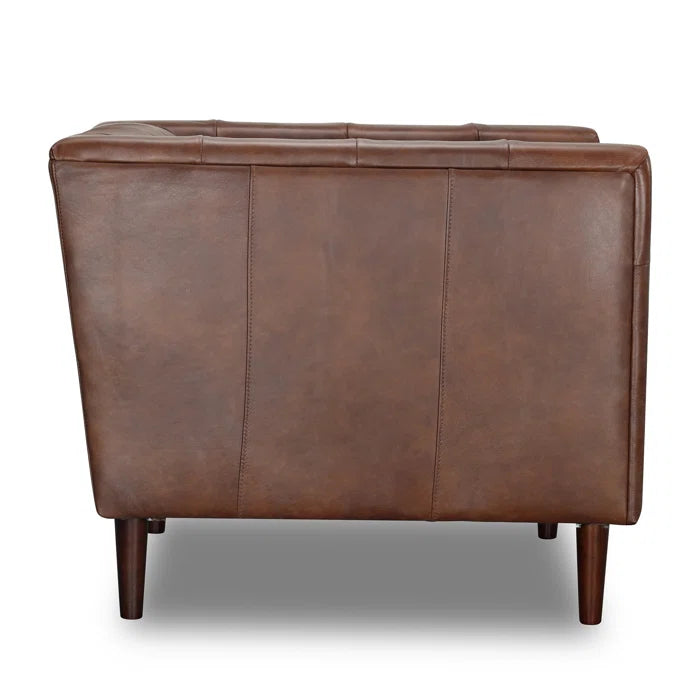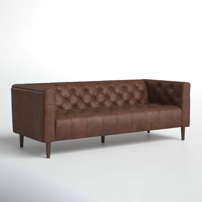 OfficeIn Chesterfield Sofa – A timeless button-tufted leather sofa featuring rich two-tone upholstery that develops a unique patina over time. Built with kiln-dried hardwood, plush foam and feather cushions, and sturdy rubberwood legs, it blends classic charm with lasting comfort.
